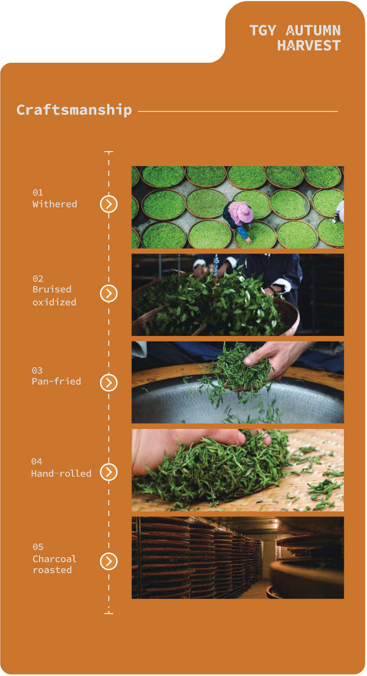 Tie Guan Yin or ‘Iron Goddess of Mercy’ is a classic representative of lightly oxidized oolong, which combines the freshness of green tea and dense body of black tea. Compared to those harvested in spring, Autumn Harvest TGY is of better quality for its luring orchid aroma and an extraordinary sweet afternote.