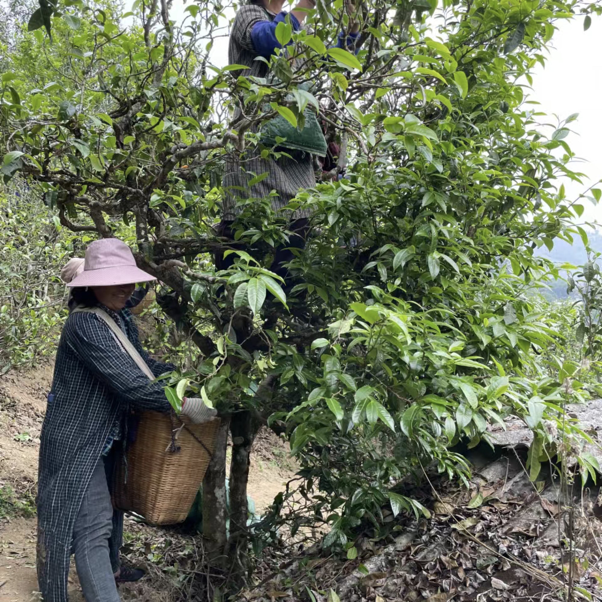 Because the ancient pu-erh trees are wild and hundred years old, farmers have to climb on trees to pick the tenderest buds.